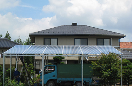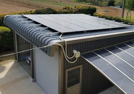 トラックを納める木製カーポートを制作し、その上に三菱重工製パネルを備え付けました。