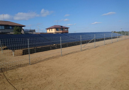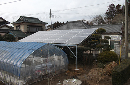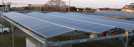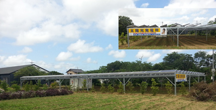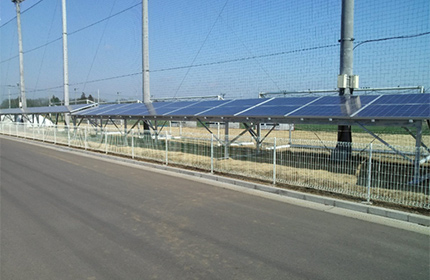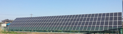 弊社敷地にある、全量買取型太陽光発電装置のデモ機です。下の敷地を有効利用したいとお考えの方に、実物でご提案します。
